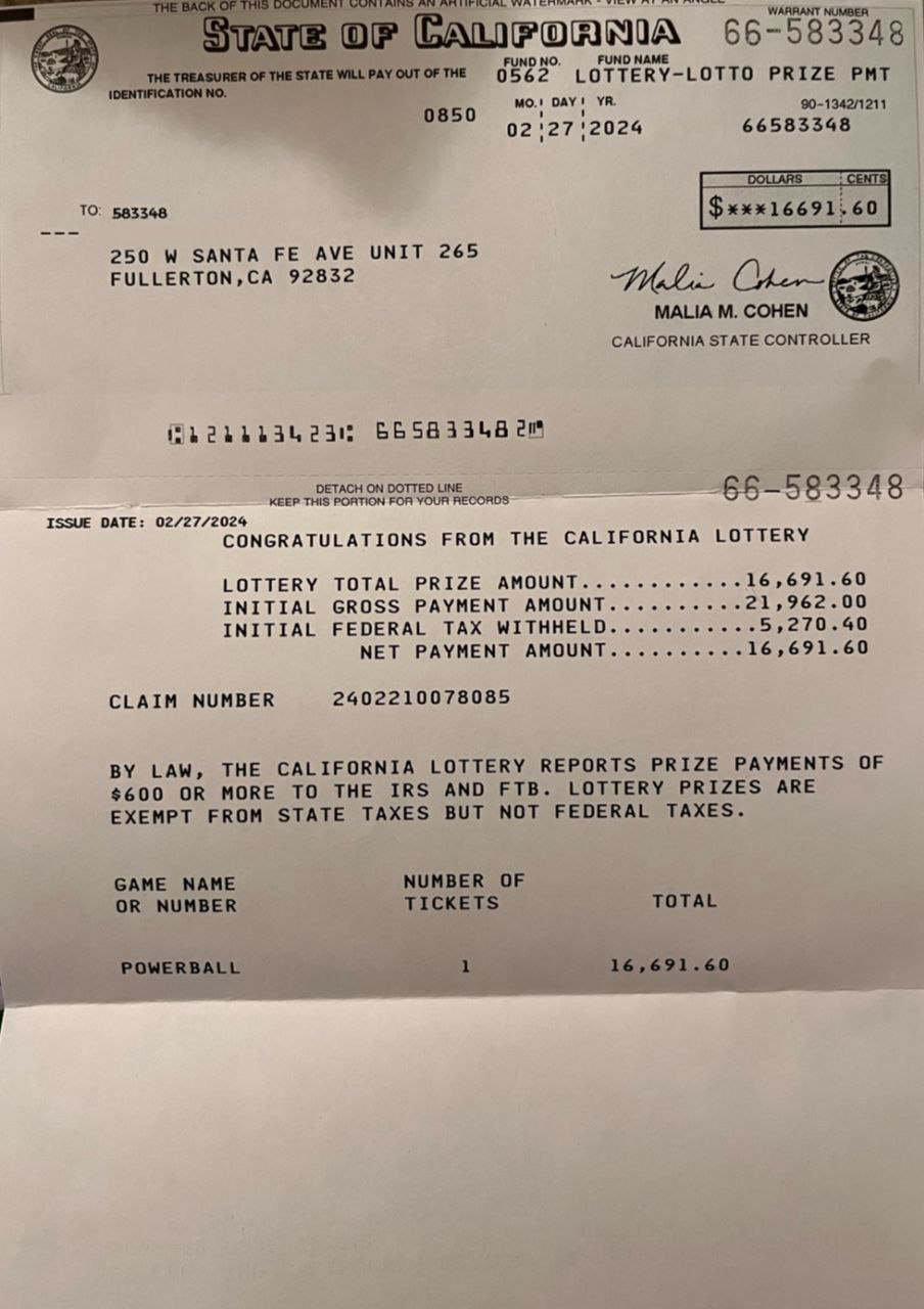 당첨금 수령은 당사에서 해당 실물 복권을 캘리포니아 복권국에 제출하여 약 8주~10주 정도의 당첨자 지급 절차를 거쳐 세금을 제외한 후 수령합니다.(세금 24% + 소득세 10%)