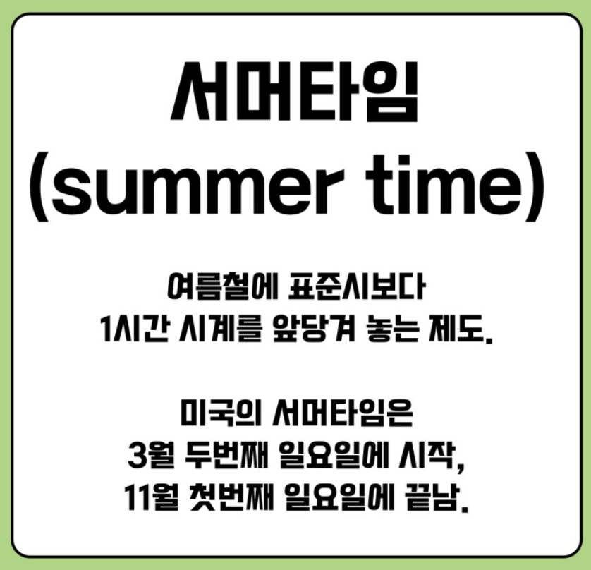 대만민국에서의 공식 명칭은 미국식 표현의 번역인 일광절약시간제로, 시계(표준시)를 한 시간 앞당겨 생활하는 것을 지칭합니다.예를 들어 9시를 10로 변경하고, 1시를 2시로 변경하는 것입니다.미국에서 써머타임은 매년 3월 두번째 일요일 2시, 그리고 11월 첫 일요일 2시까지 적용하며, 써머타임 적용 기간 복권(로또) 추첨일시 역시 한국시간으로 1시간 빨라지게 됩니다.