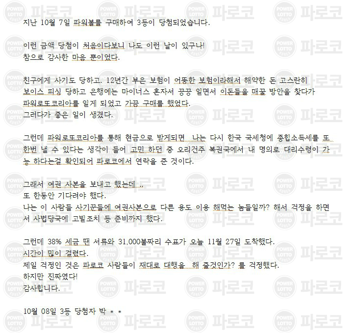 이번 3등 당첨금은 "당첨자 본인 명의" 당첨금 수령으로 회원님의 간곡한 요청에 의해