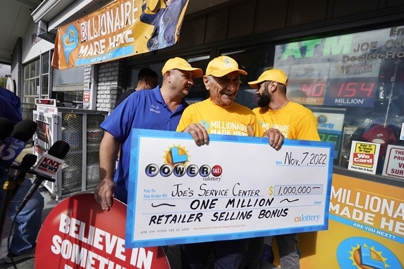 ▲ 8일(현지시간) 미국 캘리포니아주 알타데나에서 자동차 수리점을 운영하는 조셉 차하예드가 1등짜리 파워볼 복권 판매에 따른 100만 달러(약 13억 7000만원) 인센티브를 전달받았다. 2022.11.9